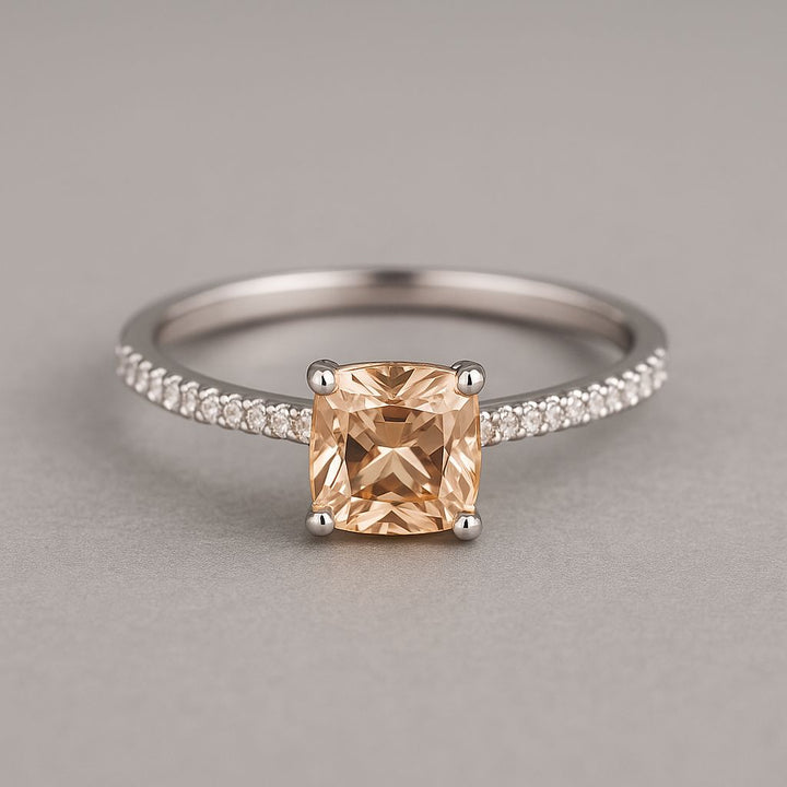 Soft, romantic, and subtly captivating, the peach gemstone ring symbolizes warmth, compassion, and gentle strength. With its cushion-cut brilliance, this ring glows in golden light, offering a fresh yet vintage charm that pairs beautifully with any skin tone. Ideal for those who love understated elegance with a modern twist.