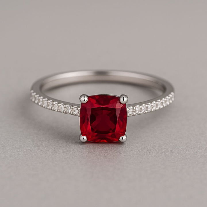 Fierce and unforgettable, the red gemstone represents love, desire, and bold confidence. Its deep hue is perfectly balanced by the cool tones of the silver band and sparkling side diamonds. Whether you’re making a statement or sealing a promise, this ring burns with intensity and allure.
