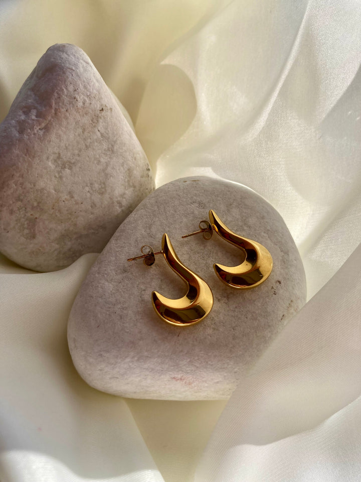 Elevate your accessory game with these exquisitely designed sculptural earrings, featuring a bold, fluid silhouette that captures both elegance and confidence. These earrings are crafted in a high-shine, gold-tone metal that gives a luxurious and radiant finish. Their unique, curved hook-like shape resembles an abstract teardrop or artistic flame, adding an avant-garde edge to a timeless gold accessory.