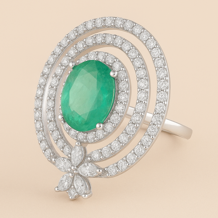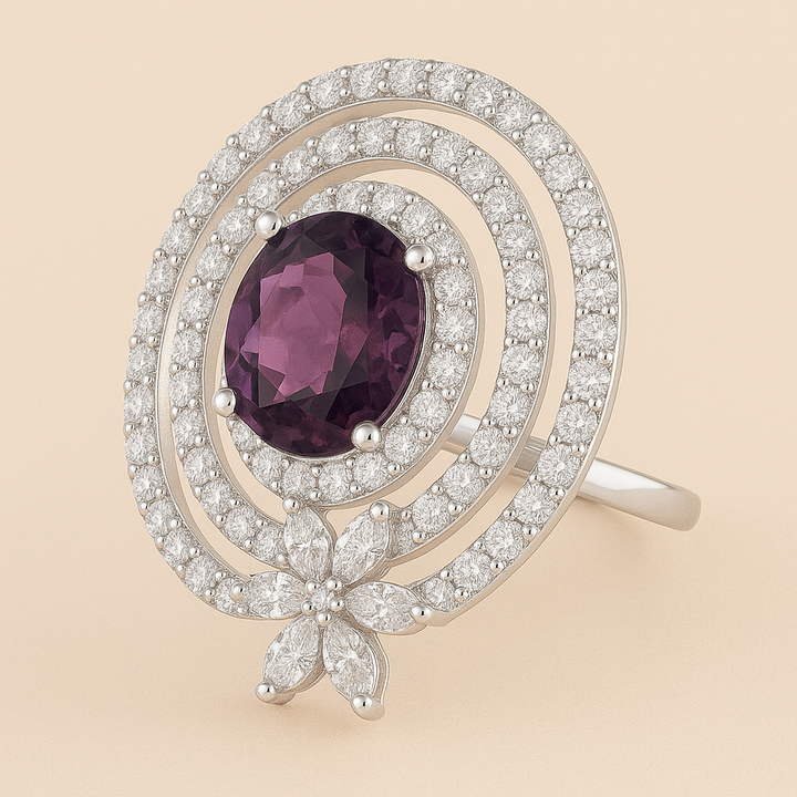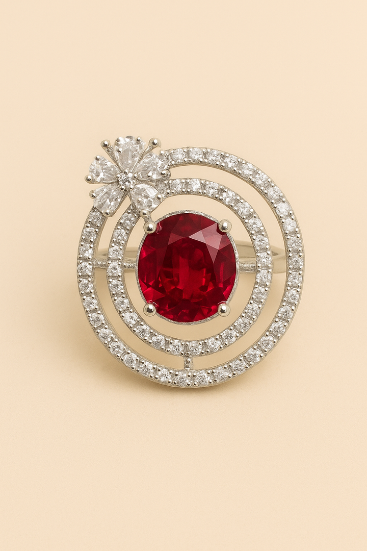 Command attention with timeless sophistication. The Royal Grace ring features a vivid ruby-red oval centerpiece embraced by three concentric halos of dazzling white stones. An elegant floral cluster blooms at the top, enhancing its regal charm. Expertly crafted in a luminous silver setting, this piece is a true embodiment of royalty and refined elegance perfect for grand occasions or making a luxurious everyday statement.